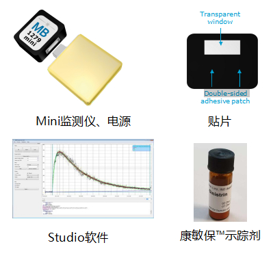 敏狄康®是用于临床前市场的经皮GFR监测系统,敏狄康®设备和康敏保荧光示踪剂阔以持续跟踪和计算动物的肾功能,通过检测康敏保tm荧光示踪剂的信号,从而测定肾小球滤过率。并且允许动物自由活动,无需血液采样、尿液收集和试剂盒检测,从而简化临床前实验的设计和执行。