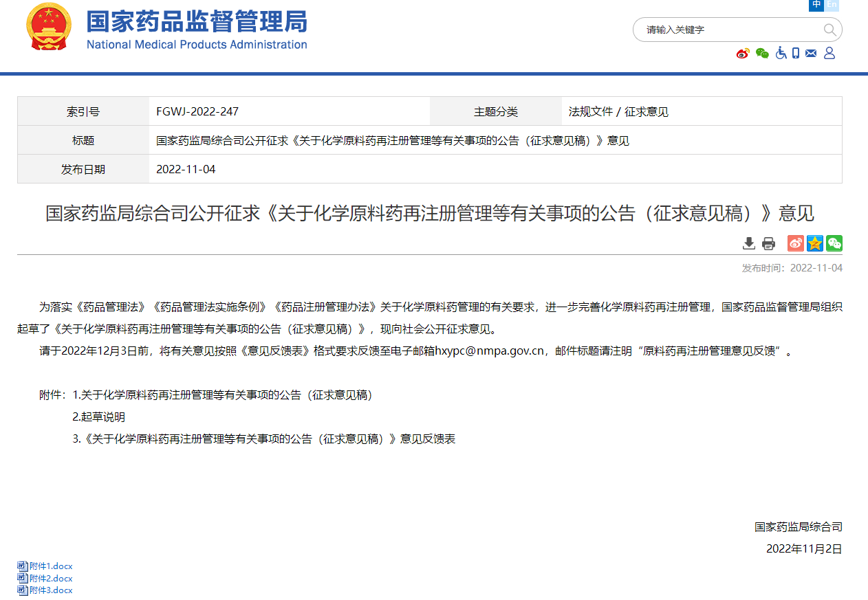 2022年11月4日,NMPA官网发布《关于化学原料药再注册管理等有关事项的公告》(征求意见稿),公示日期为:2022年11月4日~2022年12月3日,公告如下: